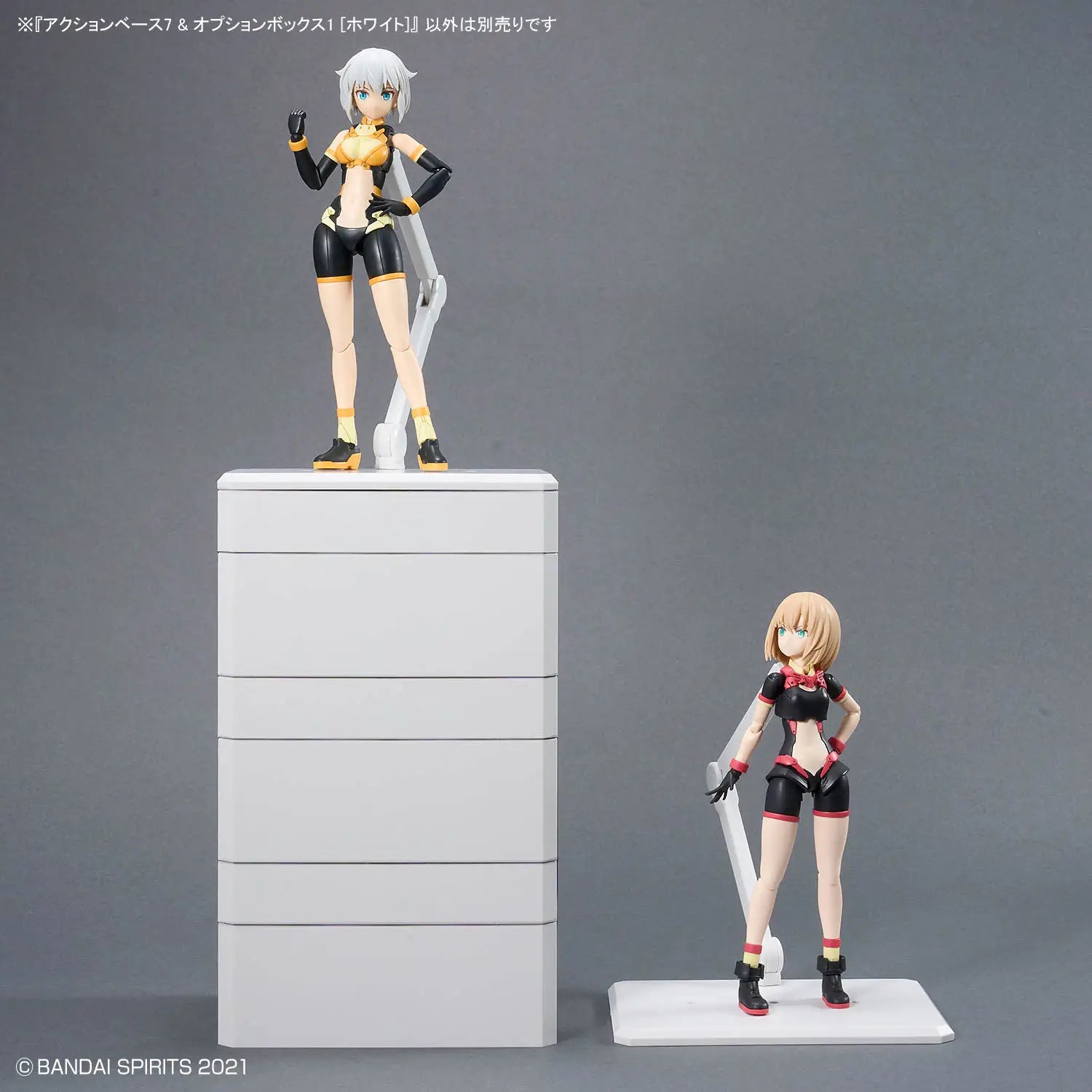 What a great idea! Bandai brings us a set of an action base with a convenient box function for storing unused parts and accessories! This item allows you to store unused parts after assembling your plastic model kit; two option boxes -- large and small -- are included. The option boxes can be stacked and connected to create different heights for display purposes, too! Order yours today!